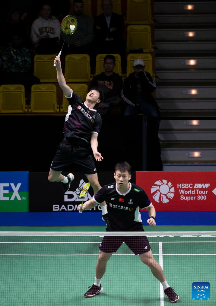 He Jiting/Ren Xiangyu (R) of China compete against Job Castillo/Luis Armando Montoya Navarro of Mexico during the men's doubles second round match at Yonex German Open 2024 badminton tournament in Muelheim, Germany, Feb 29, 2024. (Xinhua/Zhang Fan)