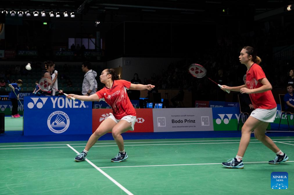 Francesca Corbett/Allison Lee (L) of the United States compete against Li Yijing/Luo Xumin of China during the women's doubles second round match at Yonex German Open 2024 badminton tournament in Muelheim, Germany, Feb 29, 2024. (Xinhua/Zhang Fan)