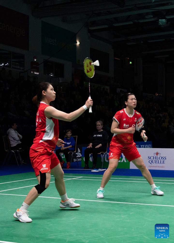 Li Yijing (L)/Luo Xumin of China compete against Francesca Corbett/Allison Lee of the United States during the women's doubles second round match at Yonex German Open 2024 badminton tournament in Muelheim, Germany, Feb 29, 2024. (Xinhua/Zhang Fan)