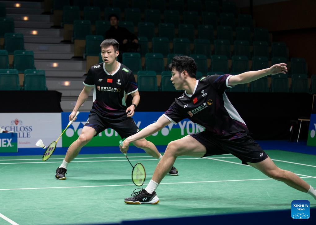 He Jiting (below, 2nd R)/Ren Xiangyu (below, 1st R) of China compete against Job Castillo/Luis Armando Montoya Navarro of Mexico during the men's doubles second round match at Yonex German Open 2024 badminton tournament in Muelheim, Germany, Feb 29, 2024. (Xinhua/Zhang Fan)