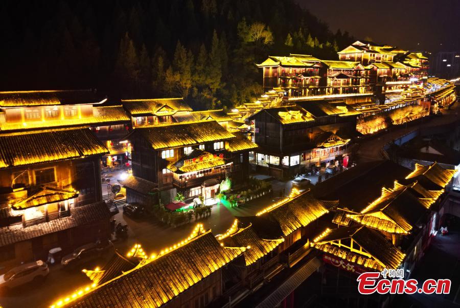 Youzhou ancient town is lit up at night, creating a dream-like scenery in Youyang Tujia and Miao Autonomous County, Chongqing, Feb. 29, 2024. (Photo: China News Service/Zhou Yi)