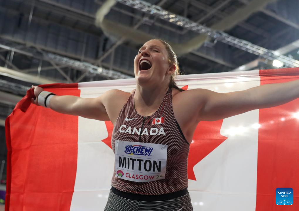 Sarah Mitton of Canada celebrates after winning the women's shot put final of the 2024 World Athletics Indoor Championships in Glasgow, Britain, March 1, 2024. (Xinhua/Li Ying)