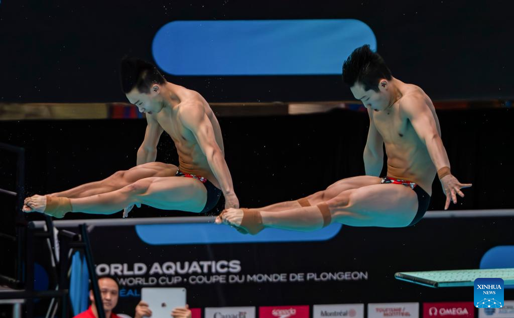 Long Daoyi(L)/Wang Zongyuan of China compete during the men's 3m synchronised final at the World Aquatics Diving World Cup 2024 in Montreal, Canada, March 2, 2024. (Photo by Liu Jiahuan/Xinhua)