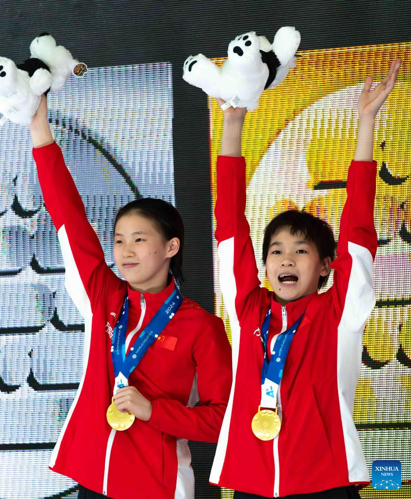 Gold medalists Chen Yuxi (L) and Quan Hongchan of China celebrate during the awarding ceremony for the women's 10m synchronised event at the World Aquatics Diving World Cup 2024 in Montreal, Canada, March 2, 2024. (Photo by Liu Jiahuan/Xinhua)