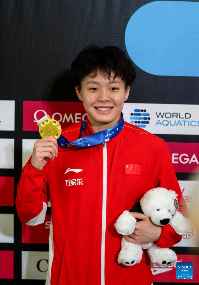 Gold medalist Chen Yiwen of China poses for photos during the awarding ceremony for the women's 3m springboard event at the World Aquatics Diving World Cup 2024 in Montreal, Canada, March 2, 2024. (Photo by Liu Jiahuan/Xinhua)