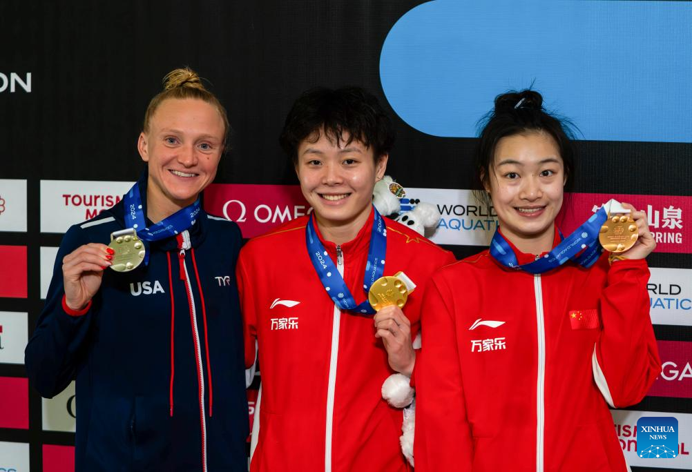 Gold medalist Chen Yiwen (C) of China, silver medalist Sarah Bacon of the United States and bronze medalist Chang Yani of China pose for photos during the awarding ceremony for the women's 3m springboard event at the World Aquatics Diving World Cup 2024 in Montreal, Canada, March 2, 2024. (Photo by Liu Jiahuan/Xinhua)