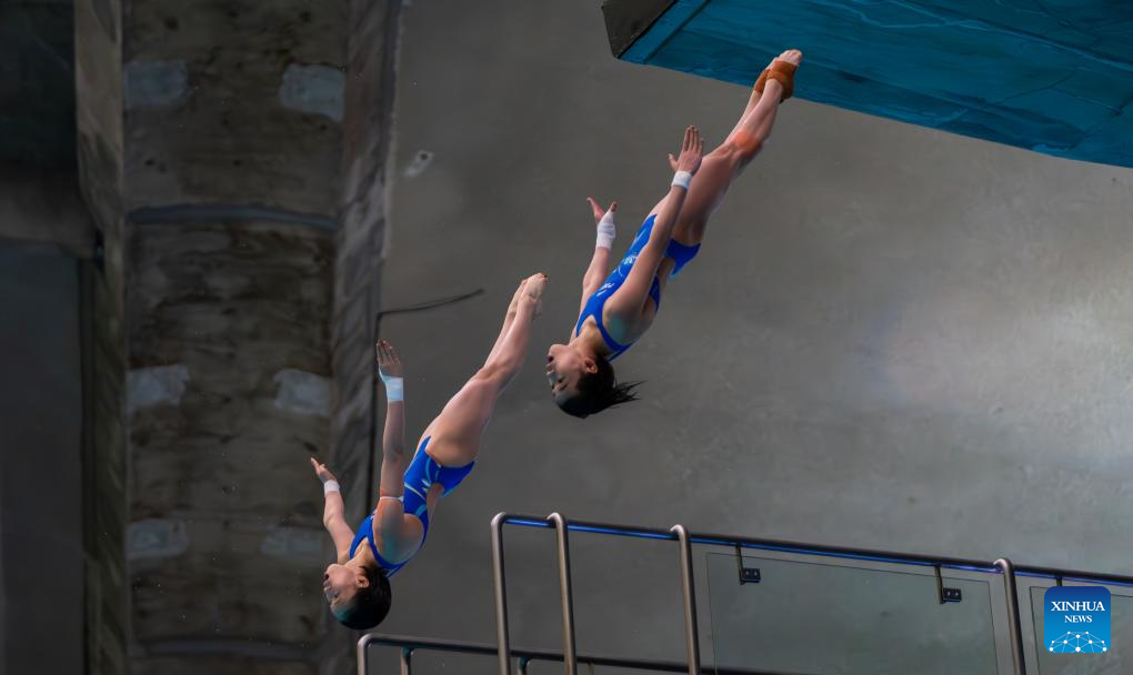 Chen Yuxi (L)/Quan Hongchan of China compete during the women's 10m synchronised final at the World Aquatics Diving World Cup 2024 in Montreal, Canada, March 2, 2024. (Photo by Liu Jiahuan/Xinhua)