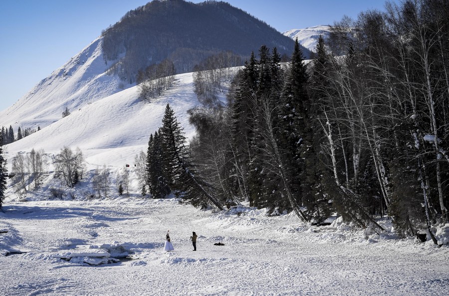 Tourists take photos in Hemu Village in Altay Prefecture, northwest China's Xinjiang Uygur Autonomous Region, Feb. 5, 2024. (Xinhua/Ma Kai)