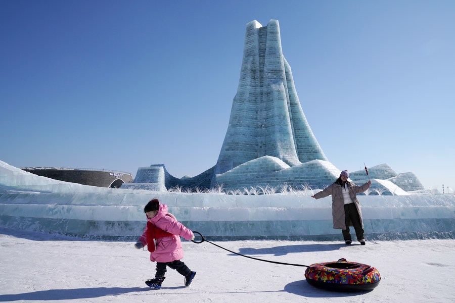 A girl enjoys her time at Harbin Ice-Snow World in Harbin, northeast China's Heilongjiang Province, Feb. 15, 2024. (Xinhua/Wang Jianwei)