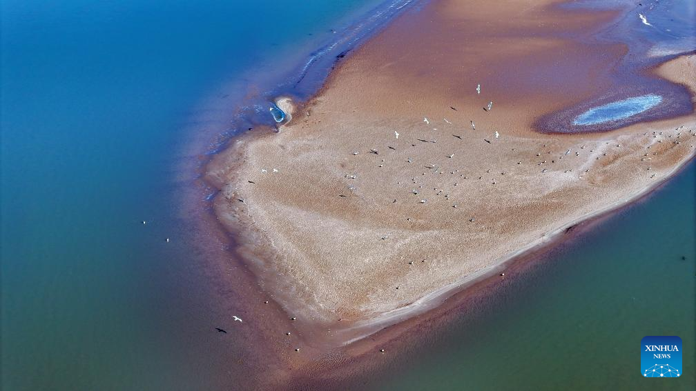An aerial drone photo taken on March 1, 2024 shows the scenery at a section of the Yellow River in northwest China's Ningxia Hui Autonomous Region. With the temperature rising, the ice in Ningxia section of the Yellow River has been gradually melting. Flocks of migratory birds fly over the tidal-flat area and the turquoise water, adding a touch of vitality to the spring scenery. (Xinhua/Wang Peng)
