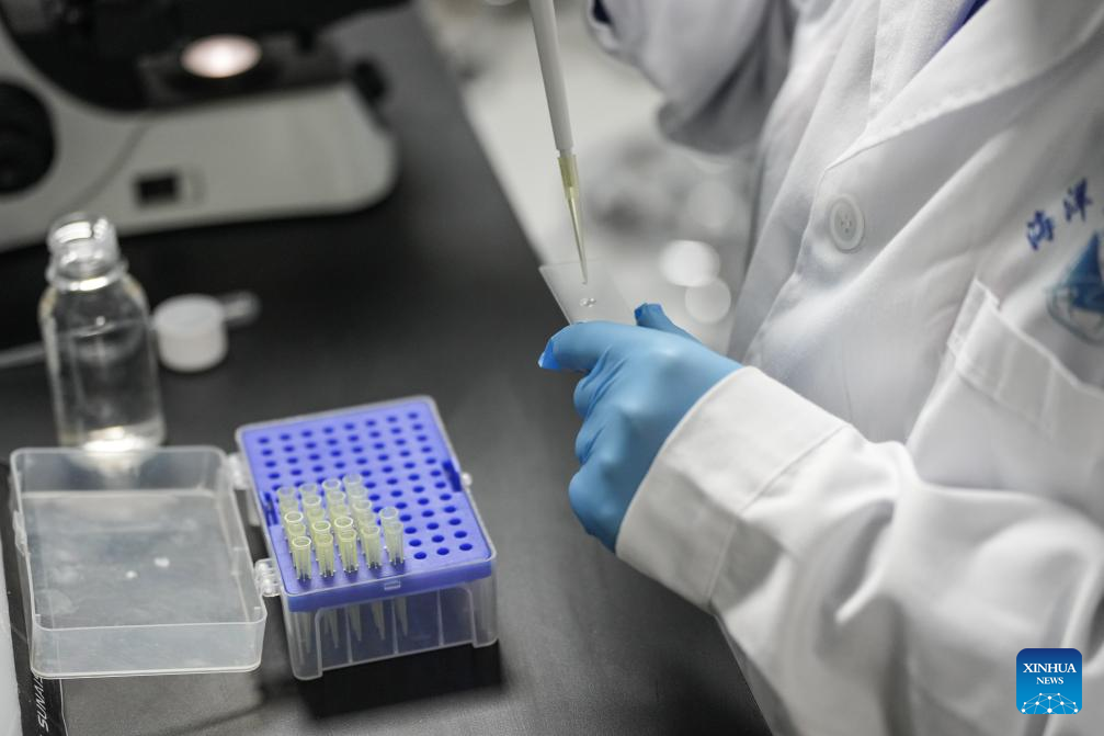 Dr. Luo Jun tests sea water samples at Dalian Sunasia Marine Biology Institute in Dalian, northeast China's Liaoning Province, Feb. 28, 2024. (Xinhua/Pan Yulong)