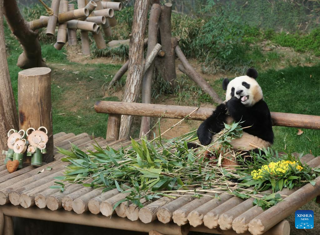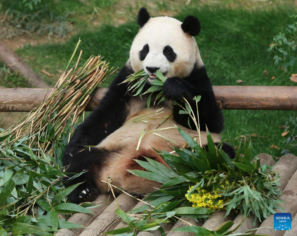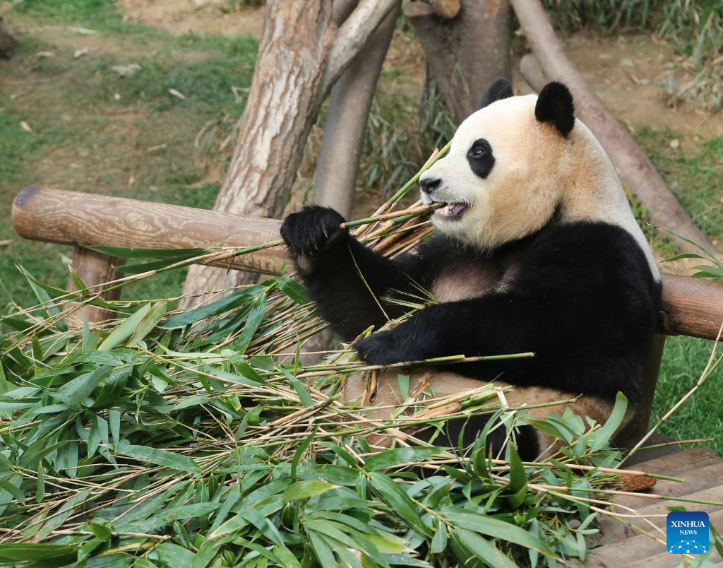 Giant panda Fu Bao eats bamboo at Everland theme park in Yongin, South Korea, March 3, 2024. Fu Bao is scheduled to return to China in April. (Xinhua/Yao Qilin)