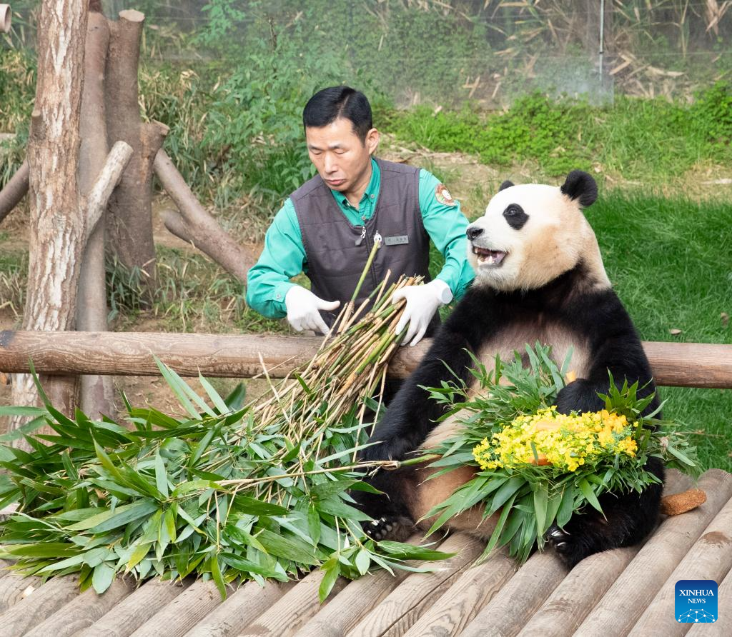 The keeper prepares food for giant panda Fu Bao at Everland theme park in Yongin, South Korea, March 3, 2024. Fu Bao is scheduled to return to China in April. (Xinhua/Yao Qilin)