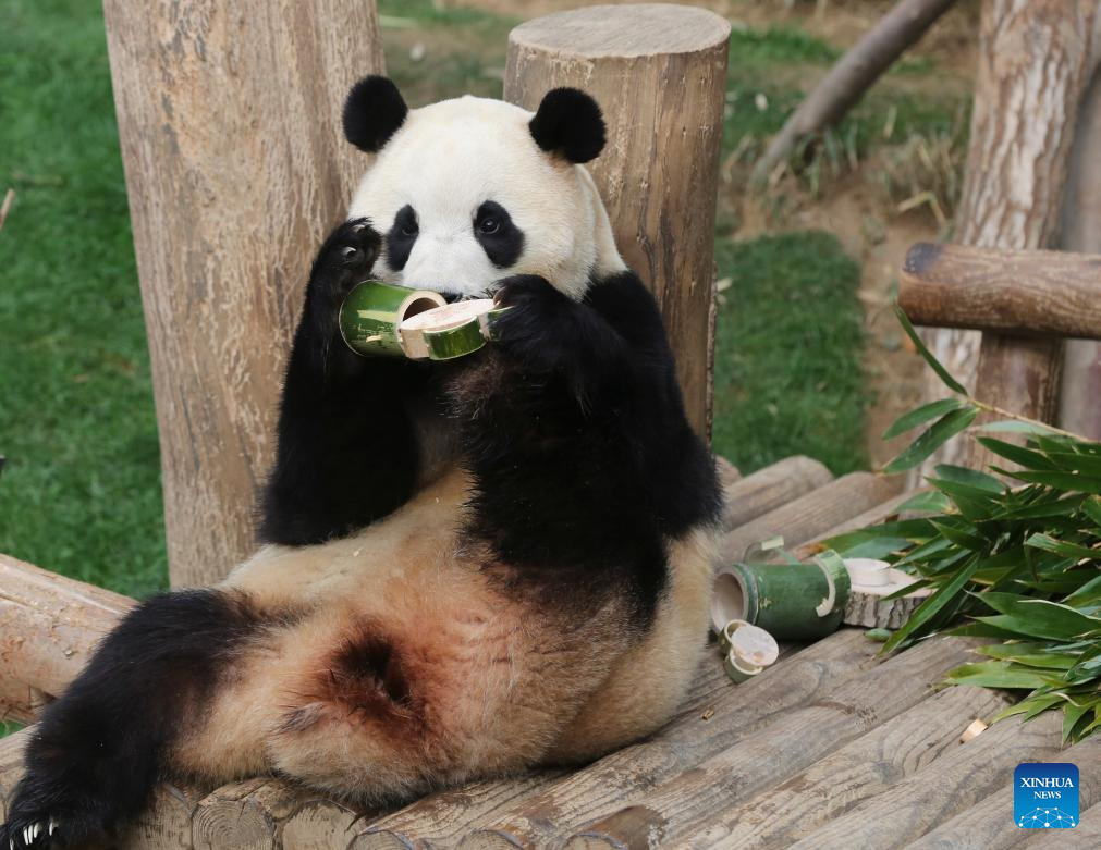 Giant panda Fu Bao eats food at Everland theme park in Yongin, South Korea, March 3, 2024. Fu Bao is scheduled to return to China in April. (Xinhua/Yao Qilin)