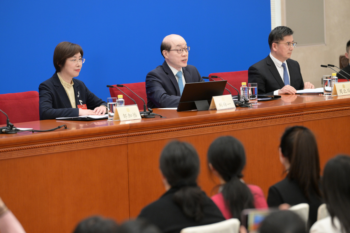 Liu Jieyi, spokesperson for the second session of the 14th CPPCC National Committee, briefs the press on the session on March 3, 2024. [Photo/Xinhua]