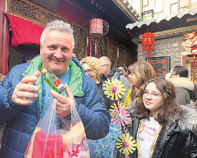 A tourist from Poland shows a bottle of liquor he bought during his tour in Beijing. (Photo courtesy of CYTS International Travel. Co., Ltd.)