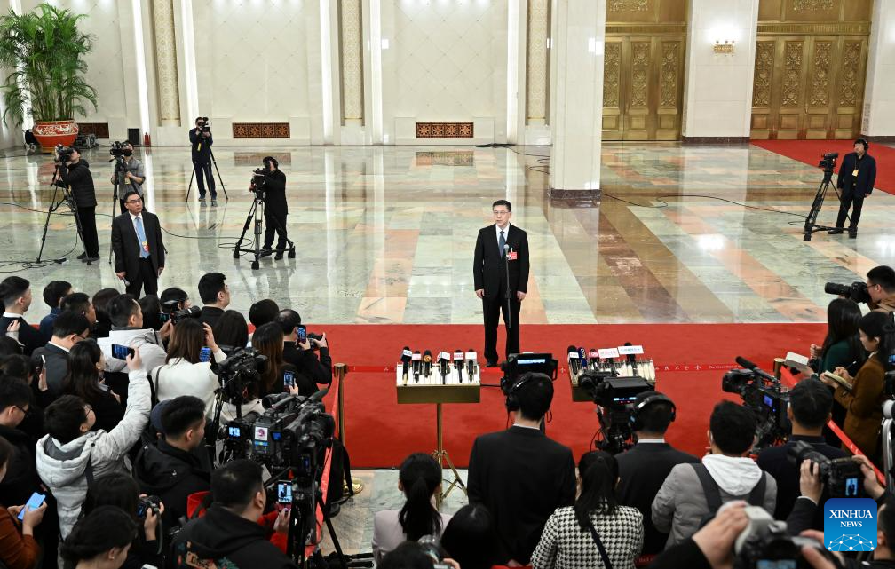 Chinese Minister of Science and Technology Yin Hejun gives an interview after the opening meeting of the second session of the 14th National People's Congress (NPC) at the Great Hall of the People in Beijing, capital of China, March 5, 2024. (Xinhua/Liu Xu)
