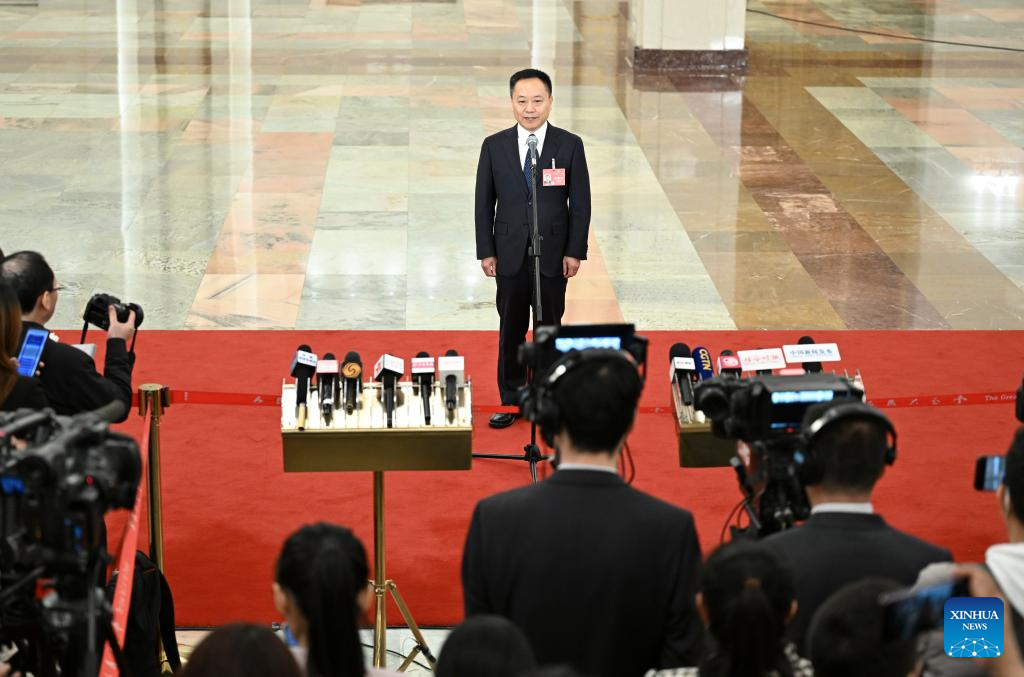 Chinese Minister of Water Resources Li Guoying gives an interview after the opening meeting of the second session of the 14th National People's Congress (NPC) at the Great Hall of the People in Beijing, capital of China, March 5, 2024. (Xinhua/Li Xin)