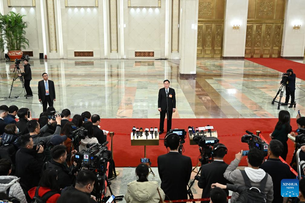 Chinese Minister of Water Resources Li Guoying gives an interview after the opening meeting of the second session of the 14th National People's Congress (NPC) at the Great Hall of the People in Beijing, capital of China, March 5, 2024. (Xinhua/Liu Xu)