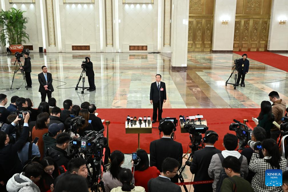 Chinese Minister of Water Resources Li Guoying gives an interview after the opening meeting of the second session of the 14th National People's Congress (NPC) at the Great Hall of the People in Beijing, capital of China, March 5, 2024. (Xinhua/Mu Yu)