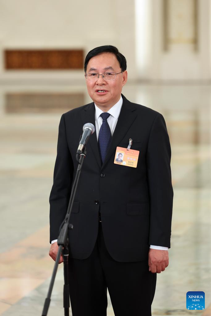 Chinese Minister of Science and Technology Yin Hejun gives an interview after the opening meeting of the second session of the 14th National People's Congress (NPC) at the Great Hall of the People in Beijing, capital of China, March 5, 2024. (Xinhua/Mu Yu)