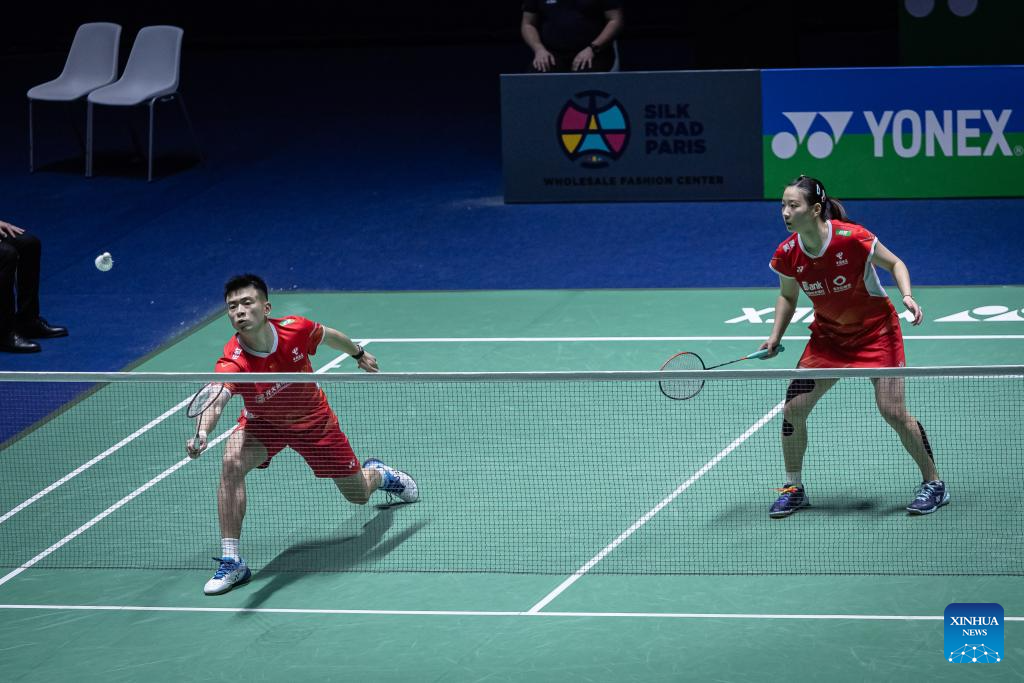 Zheng Siwei (L)/Huang Yaqiong compete during the mixed doubles first round match between Zheng Siwei/Huang Yaqiong of China and Ty Alexander Linderman/Josephine Wu of Canada at the French Open badminton tournament in Paris, France, March 5, 2024. (Photo by Aurelien Morissard/Xinhua)