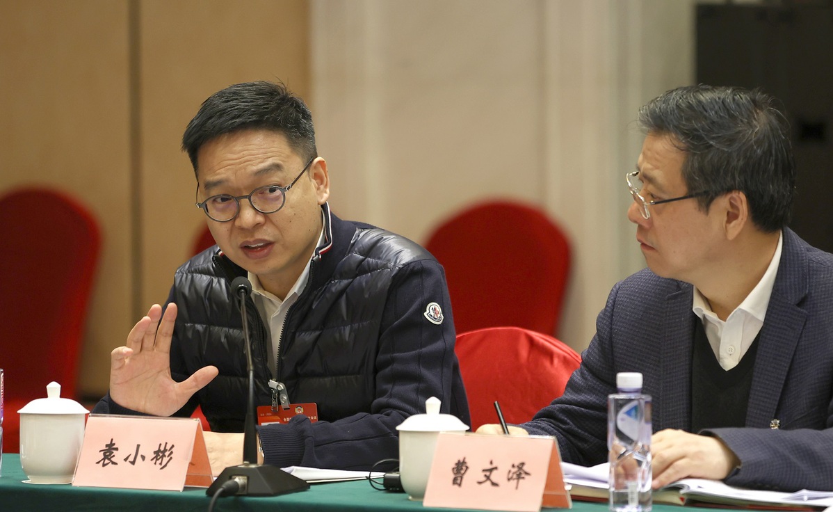 Yuan Xiaobin, left, a member of the 14th National Committee of the Chinese People's Political Consultative Conference, speaks at a panel discussion on the Government Work Report on March 6, 2024. [Photo by Zou Hong/chinadaily.com.cn]