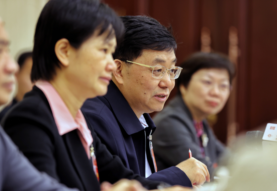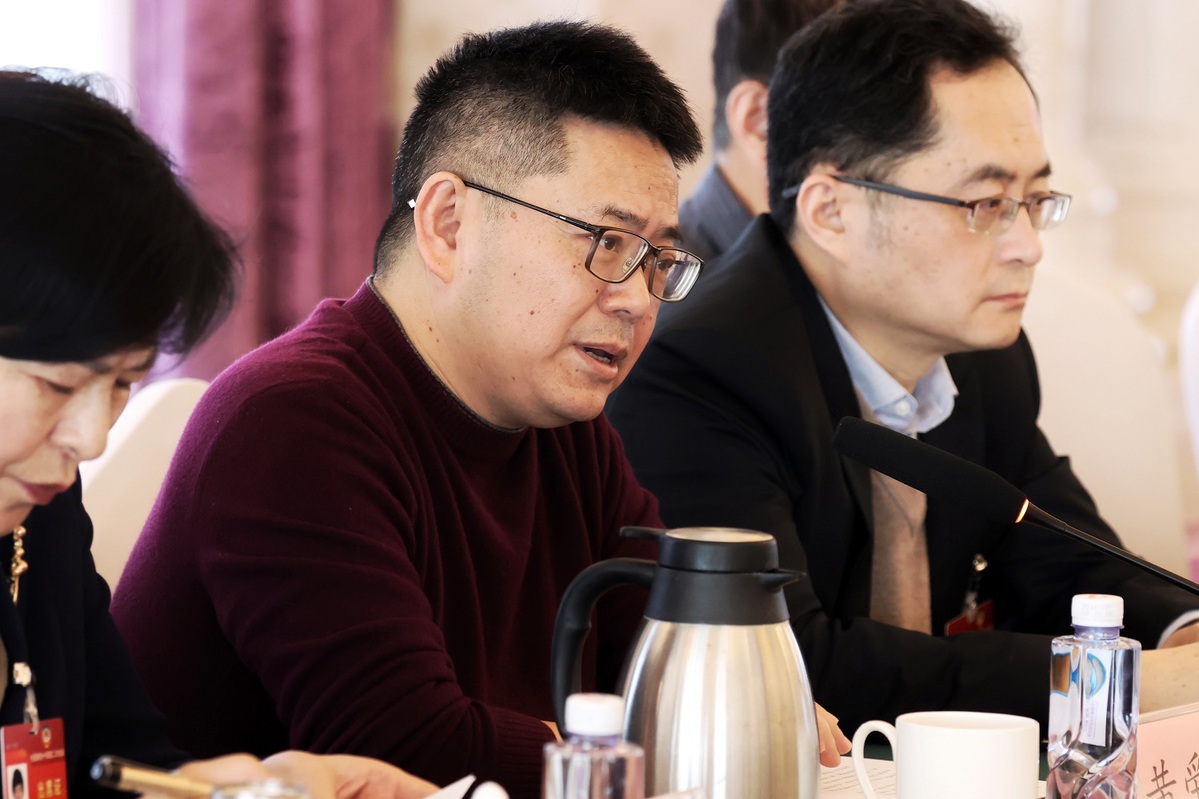 Ding Guanghong, center, a member of the 14th National Committee of the Chinese People's Political Consultative Conference, speaks at a panel discussion on the Government Work Report on March 6, 2024. [Photo by Jiang Dong/chinadaily.com.cn]