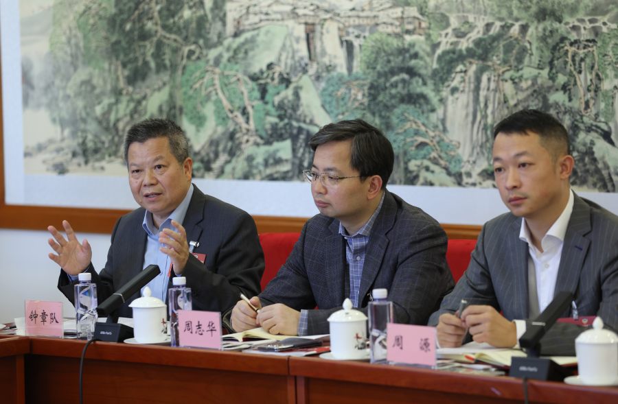 Zheng Yongfei, front, a member of the 14th National Committee of the Chinese People's Political Consultative Conference, speaks at a panel discussion on the Government Work Report on March 6, 2024. [Photo by Jiang Dong/chinadaily.com.cn]