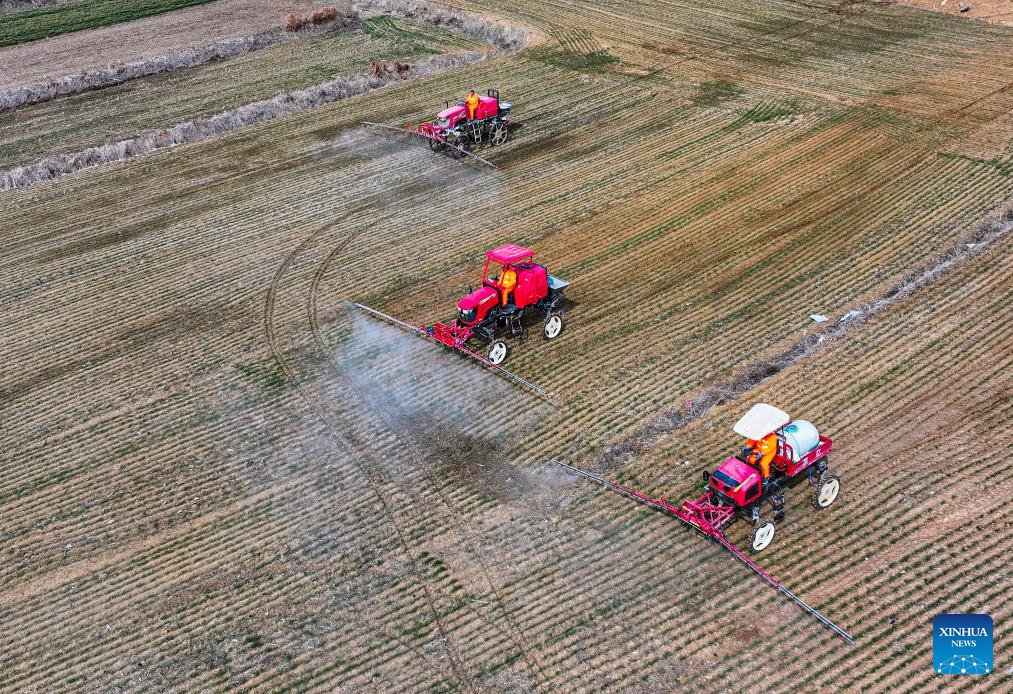An aerial drone photo taken on March 6, 2024 shows agricultural machines spraying insecticides in a wheat field in Shuangmiao Village in Hushan Township, Rongcheng, east China's Shandong Province. Farmers in many regions of China are busy in the fields with spring ploughing, sowing and other agricultural activities. (Photo by Li Xinjun/Xinhua)