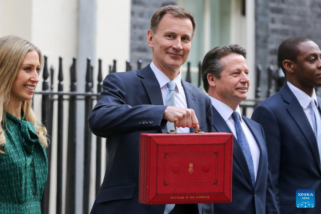 The United Kingdom's (UK) Chancellor of the Exchequer Jeremy Hunt (1st R) leaves 11 Downing Street to deliver his budget to Parliament in London, Britain, on March 6, 2024. The United Kingdom's (UK) Chancellor of the Exchequer Jeremy Hunt on Wednesday announced in his spring budget that National Insurance contributions would be cut for 27 million British workers. (Xinhua)