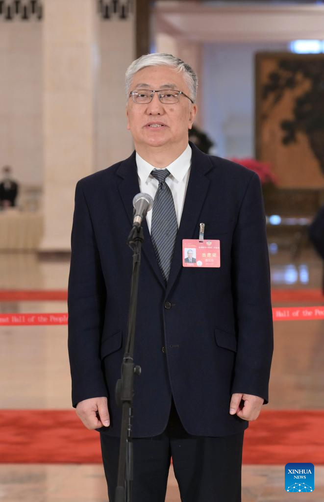 Zheng Jun, a member of the 14th National Committee of the Chinese People's Political Consultative Conference (CPPCC), is interviewed ahead of the second plenary meeting of the second session of the 14th CPPCC National Committee at the Great Hall of the People in Beijing, capital of China, March 7, 2024. (Xinhua/Li He)
