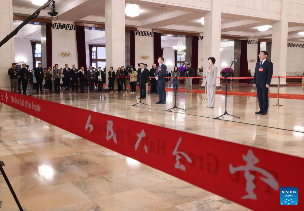 Members of the 14th National Committee of the Chinese People's Political Consultative Conference (CPPCC) are interviewed ahead of the second plenary meeting of the second session of the 14th CPPCC National Committee at the Great Hall of the People in Beijing, capital of China, March 7, 2024. (Xinhua/Xing Guangli)