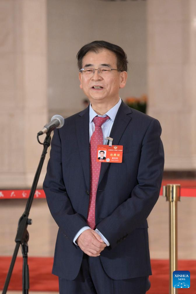 Huang Baorong, a member of the 14th National Committee of the Chinese People's Political Consultative Conference (CPPCC), is interviewed ahead of the second plenary meeting of the second session of the 14th CPPCC National Committee at the Great Hall of the People in Beijing, capital of China, March 7, 2024. (Xinhua/Li He)