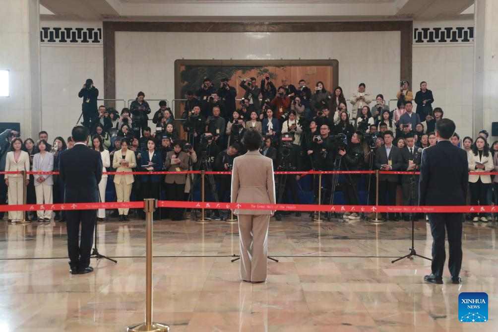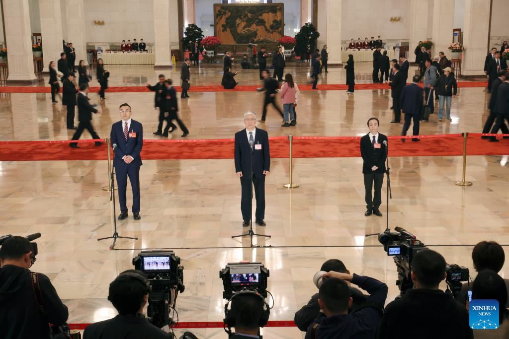 Members of the 14th National Committee of the Chinese People's Political Consultative Conference (CPPCC) are interviewed ahead of the second plenary meeting of the second session of the 14th CPPCC National Committee at the Great Hall of the People in Beijing, capital of China, March 7, 2024. (Xinhua/Jin Liwang)