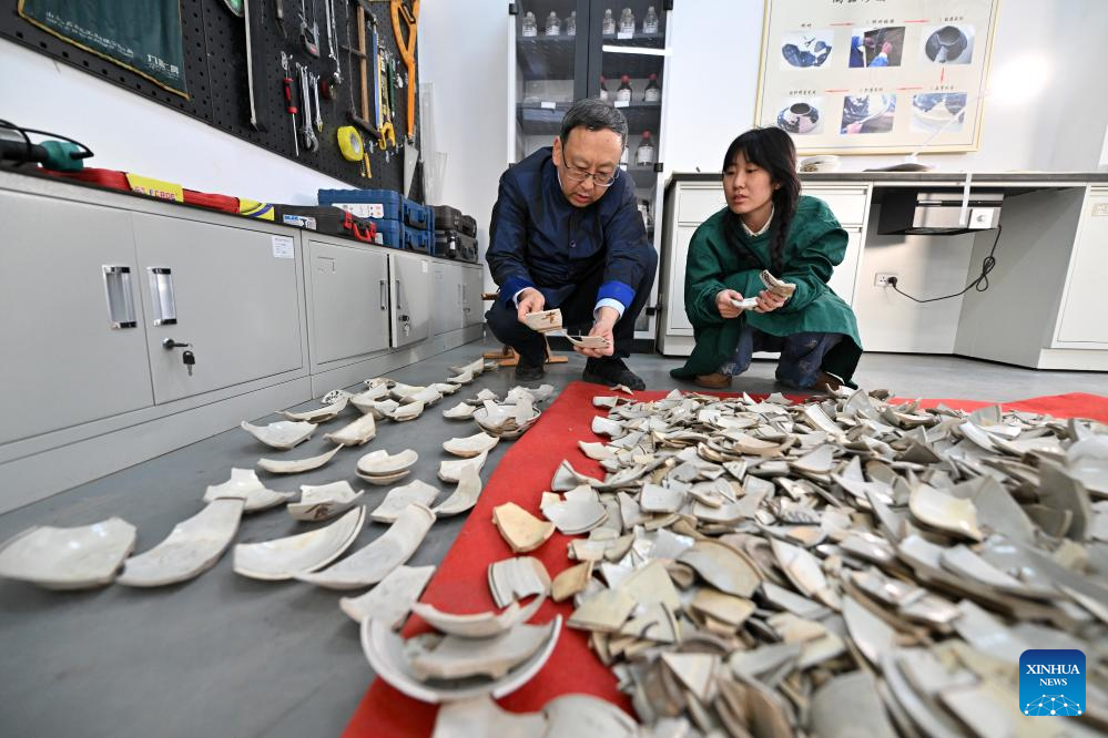 Hang Kan (L) communicates with a colleague about the measures of porcelain restoration at the research institute of the Yungang Grottoes in Datong, north China's Shanxi Province, Feb. 25, 2024.(Xinhua/Zhan Yan)