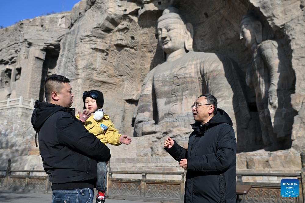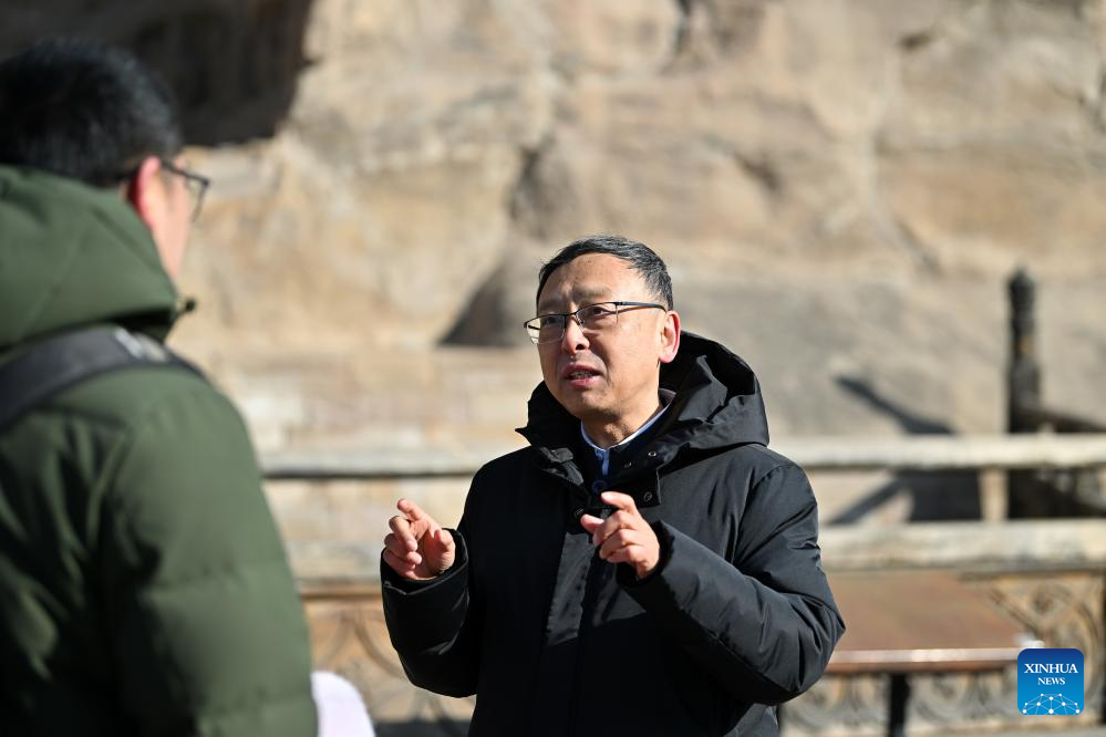 Hang Kan (2nd R) talks with tourists and learns about their requests at the Yungang Grottoes in Datong, north China's Shanxi Province, Feb. 25, 2024.(Xinhua/Zhan Yan)