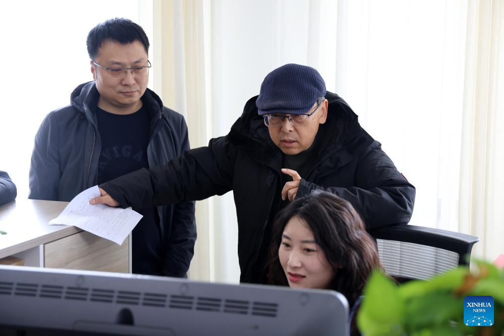 Hang Kan (C) and his colleagues exchange ideas about the collection scheme with digital technology of the Yungang Grottoes in Datong, north China's Shanxi Province, Dec. 29, 2023.(Xinhua)