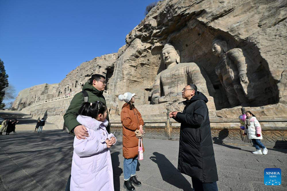 Hang Kan (R) introduces the history of Yungang Grottoes to tourists at the Yungang Grottoes in Datong, north China's Shanxi Province, Feb. 25, 2024. (Xinhua/Zhan Yan)