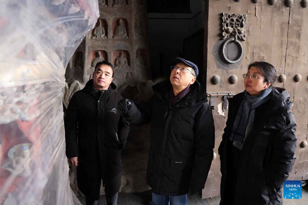Hang Kan (3rd L) communicates with colleagues about the measures of mural restoration at the research institute of the Yungang Grottoes in Datong, north China's Shanxi Province, Feb. 25, 2024.(Xinhua/Zhan Yan)