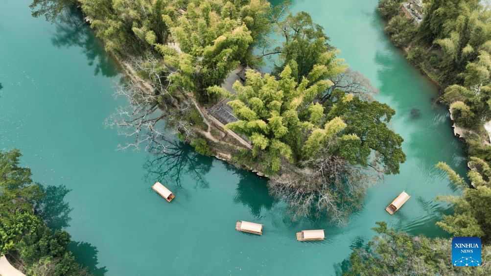 Visitors take a bamboo raft ride to enjoy the scenery of Daxiaojing scenic spot in Luodian County, southwest China's Guizhou Province, March 7, 2024. (Xinhua/Yang Ying)