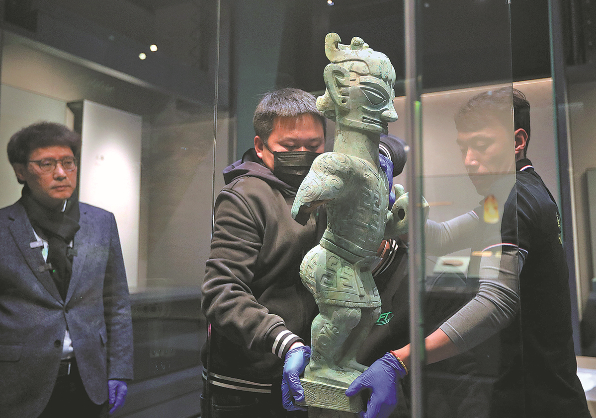 A standing bronze statue is moved into a cabinet for an upcoming exhibition at the Shanghai Museum ahead of the inauguration of a new venue in Pudong New Area. The statue, unearthed from the Sanxingdui Ruins in Sichuan province, demonstrates the high level of civilization in Sichuan some 3,000 years ago. LIU YING/XINHUA