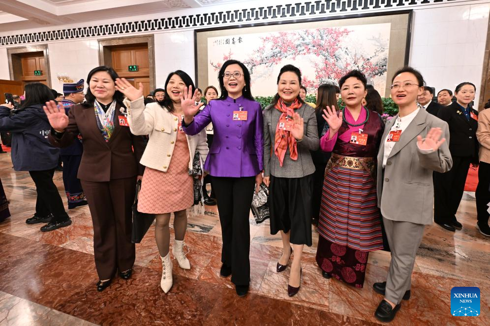 Deputies to the 14th National People's Congress (NPC) Lu Dan (L), Zhao Ziyi(C) and Fu Qingmei walk out of the Great Hall of the People after attending the second plenary meeting of the second session of the 14th NPC in Beijing, capital of China, March 8, 2024. (Xinhua/Li Ga)