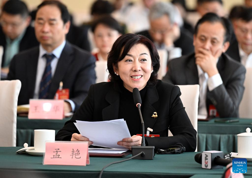 National political advisor Meng Yan speaks at a meeting of national political advisors from the sector of education at the second session of the 14th National Committee of the Chinese People's Political Consultative Conference (CPPCC) in Beijing, capital of China, March 7, 2024. (Xinhua/Chen Yehua)