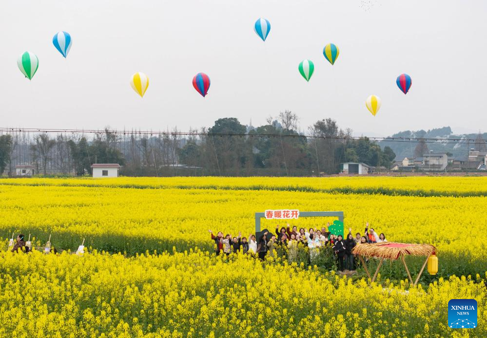 Tourists enjoy view of rapeseed flowers in Lianghe Village, China's Sichuan