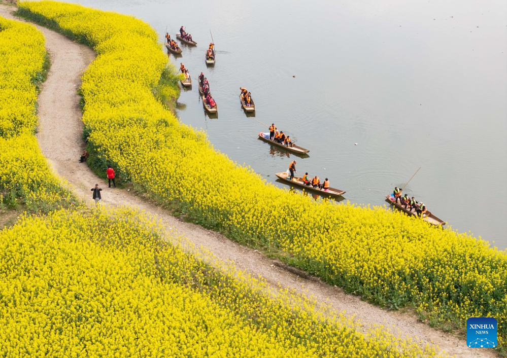 An aerial drone photo taken on March 7, 2024 shows tourists on boats enjoying the view of rapeseed flowers in Lianghe Village, Qionglai City, Chengdu, southwest China's Sichuan Province. (Xinhua/Jiang Hongjing)