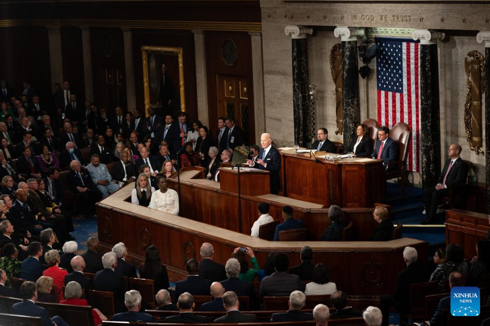 WASHINGTON, March 8 (Xinhua) -- Amid widespread concerns over high prices, economic uncertainty, the border crisis and geopolitical tensions, U.S. President Joe Biden delivered a highly partisan State of the Union address on Thursday night.