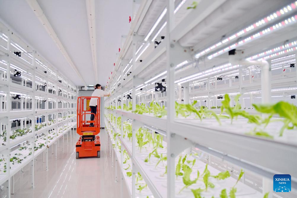 A worker checks the growth of hydroponic vegetables at a modern agriculture demonstration park in Guantao County, north China's Hebei Province, March 8, 2024. In recent years, Guantao County has applied smart technologies to agricultural production, giving impetus to the modernization of agriculture. (Xinhua/Wang Xiao)