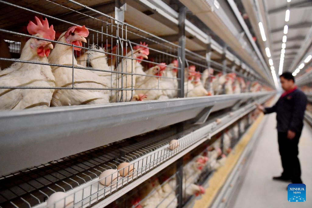 A worker checks the operation of automated breeding equipment at a chicken farm in Guantao County, north China's Hebei Province, March 8, 2024. In recent years, Guantao County has applied smart technologies to agricultural production, giving impetus to the modernization of agriculture. (Xinhua/Wang Xiao)
