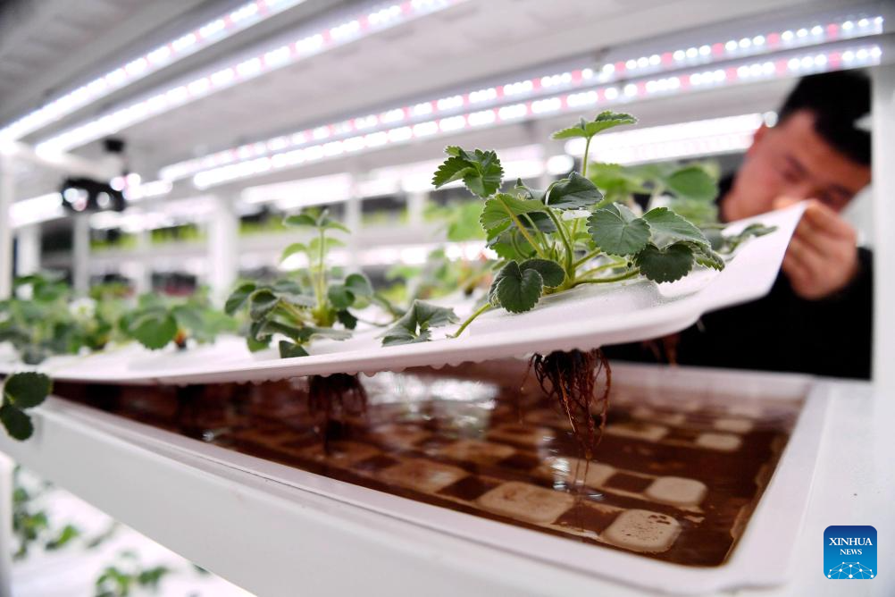 A worker checks the growth of hydroponic strawberries at a modern agriculture demonstration park in Guantao County, north China's Hebei Province, March 8, 2024. In recent years, Guantao County has applied smart technologies to agricultural production, giving impetus to the modernization of agriculture. (Xinhua/Wang Xiao)